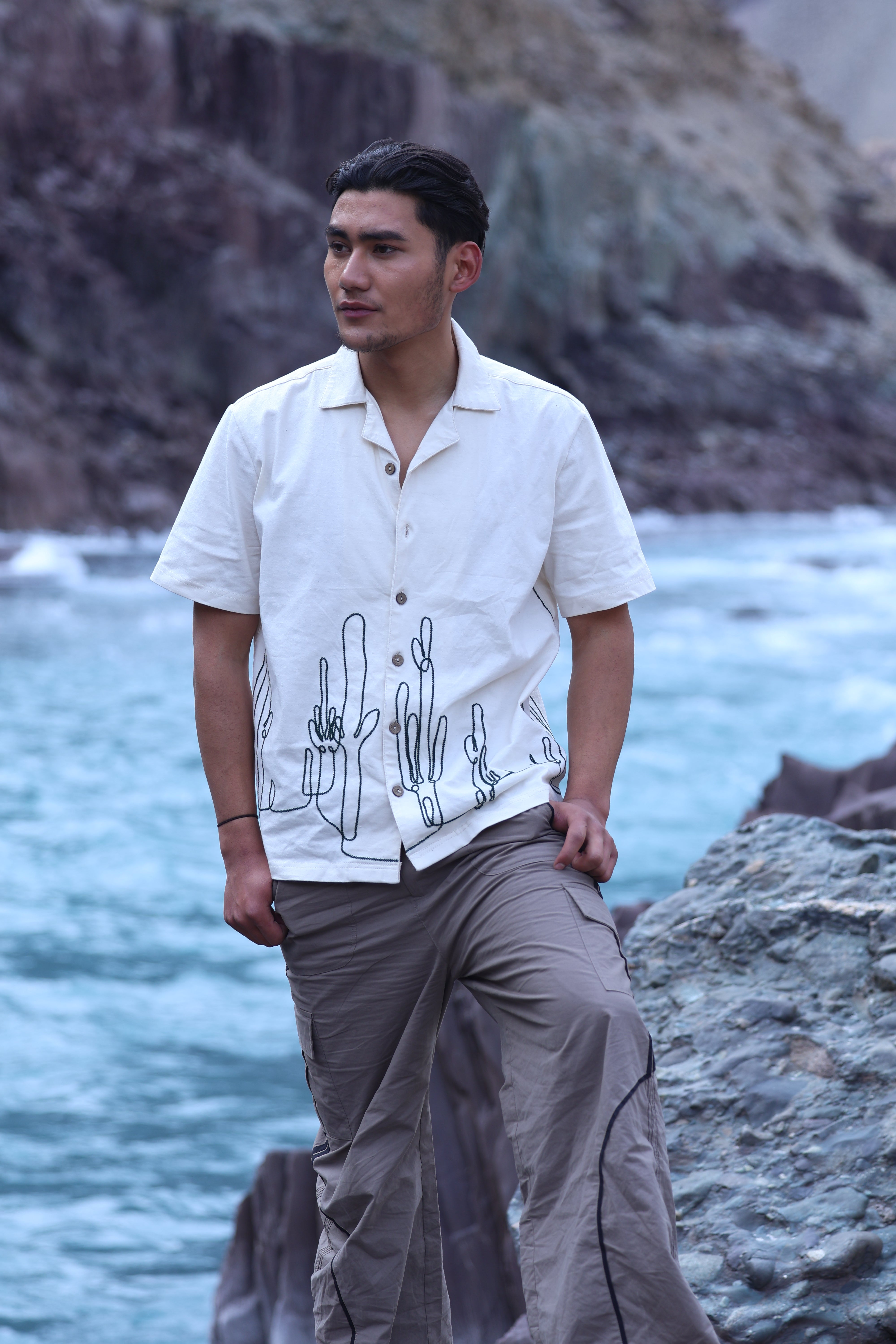 The cactus embroidered shirt from the Disrupt collection by Vasavi combines desert-inspired design with bold, unique details. With a notch collar and wooden buttons, it embodies the spirit of Break the norm, wear the change, redefining modern style.