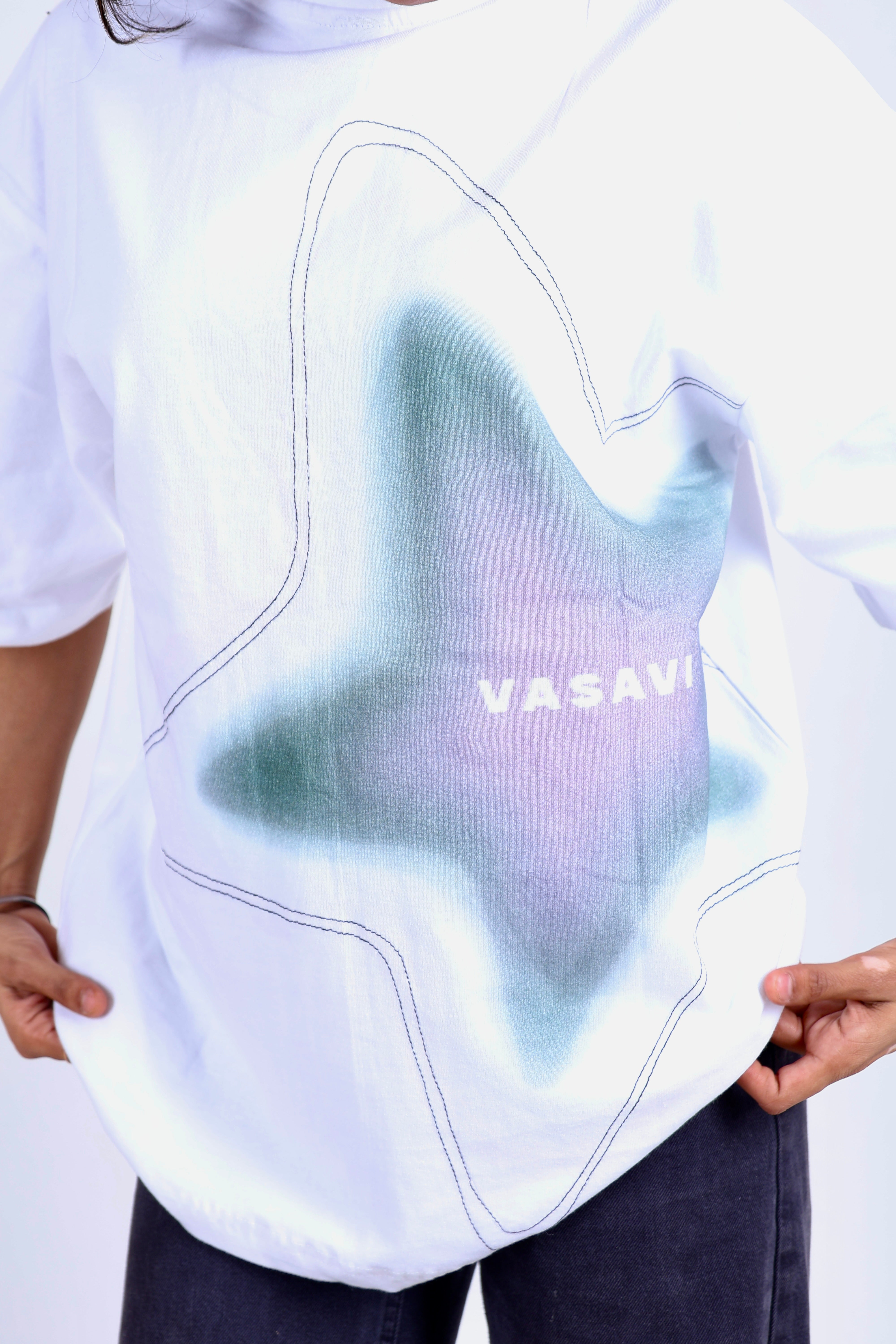 Digital print effect - Digital star print with soothing, attractive colors, creating a vibrant and visually appealing design. A unique running stitch follows the boundary of the print, which adds the edge to the design.