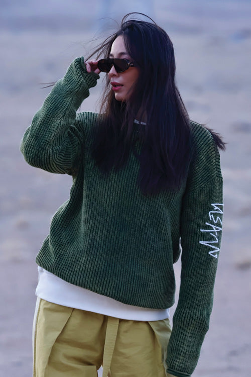 The green acid wash effect sweater, shot in the stunning Ladakh landscape, blends modern style with natural ruggedness. The unique color and running stitch embroidery stand out against the majestic mountains, while its relaxed fit and breathable knit fabric offer comfort in the cool, crisp air.